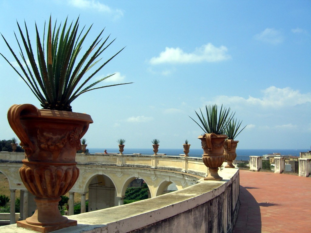 Uscendo sul terrazzo si può ammirare una delle più suggestive e panoramiche vedute sul Golfo di Napoli, da Posillipo a Ischia, per giungere a Capri e alla Penisola Sorrentina. Sui due lati del ballatoio si diramano due scale che conducono alla passeggiata scoperta del porticato, dirigendosi a destra s’intravedono quattro garitte che delimitavano una peschiera e che fungevano da riparo dal sole mentre si pescava. Sullo sfondo lo sguardo si apre verso il bosco della Reggia di Portici e l’area archeologica ercolanese.