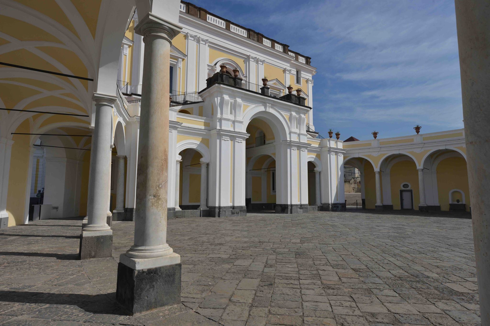 A sinistra, l’imponente scuderia ideata dal Gioffredo, con volte a crociera e pilastri in piperno. Il Vanvitelli “stravolgendo il disegno originario del Gioffredo” ridisegna completamente lo scalone della Villa, creando un rampante centrale e due laterali sul modello sperimentato a Caserta, arricchendolo con un mascherone e una grottesca situati nel lato interno dell’arco d’ingresso e da sei nicchie che scandiscono la salita al piano nobile contenenti delle statue a soggetto mitologico, il vestibolo poi, si presenta con un atrio coperto a cupola e fiancheggiato da due nicchie absidali.